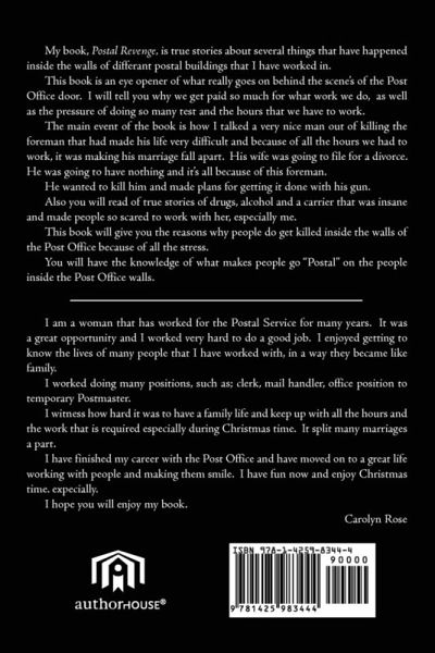 My book, Postal Revenge, is true stories about several things that have happened inside the walls of differant postal buildings that I have worked in. This book is an eye opener of what really goes on behind the scene's of the Post Office door. I will tell you why we get paid so much for what work we do, as well as the pressure of doing so many test and the hours that we have to work. The main event of the book is how I talked a very nice man out of killing the foreman that had made his life very difficult and because of all the hours we had to work, it was making his marriage fall apart. His wife was going to file for a divorce. He was going to have nothing and it's all because of this foreman. He wanted to kill him . He made plans for getting it done with his gun. Also you will read of true stories of drugs, alcohol and a carrier that was insane who made people so scared to work with her, especially me. This book will give you the reasons why people do get killed inside the walls of the Post Office because of all the stress. You will have the knowledge of what makes people go "Postal" on the people inside the Post Office walls.