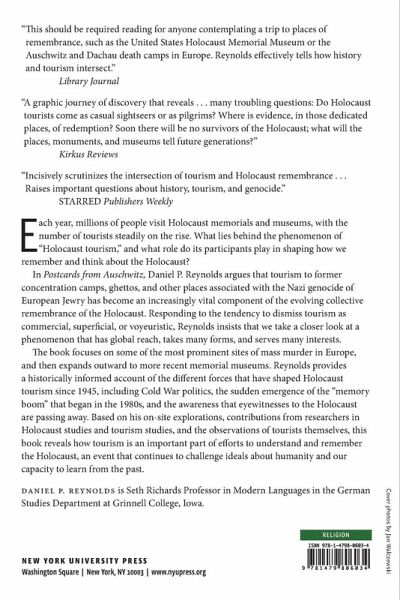 The uneasy link between tourism and collective memory at Holocaust museums and memorials Each year, millions of people visit Holocaust memorials and museums, with the number of tourists steadily on the rise. What lies behind the phenomenon of "Holocaust tourism" and what role do its participants play in shaping how we remember and think about the Holocaust? In Postcards from Auschwitz, Daniel P. Reynolds argues that tourism to former concentration camps, ghettos, and other places associated with the Nazi genocide of European Jewry has become an increasingly vital component in the evolving collective remembrance of the Holocaust. Responding to the tendency to dismiss tourism as commercial, superficial, or voyeuristic, Reynolds insists that we take a closer look at a phenomenon that has global reach, takes many forms, and serves many interests. The book focuses on some of the most prominent sites of mass murder in Europe, and then expands outward to more recent memorial museums. Reynolds provides a historically-informed account of the different forces that have shaped Holocaust tourism since 1945, including Cold War politics, the sudden emergence of the "memory boom" beginning in the 1980s, and the awareness that eyewitnesses to the Holocaust are passing away. Based on his on-site explorations, the contributions from researchers in Holocaust studies and tourism studies, and the observations of tourists themselves, this book reveals how tourism is an important part of efforts to understand and remember the Holocaust, an event that continues to challenge ideals about humanity and our capacity to learn from the past.