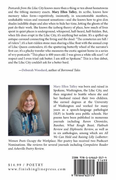 Postcards from the Lilac City knows more than a thing or ten about hometowns and the tithing memory exacts. Mary Ellen Talley, its scribe, knows how memory takes form-repetitively, insistently, in uncontestable numbers, unshakable voices and resonant sensations-and she knows how to give dim shades indelible shape and also when to bide her time, letting the ghosts of the past do their work. She knows the iceberg theory of place, how much of lives spent in quiet places is underground, whispered, half-heard, half-hidden. But, when life does erupt in the Lilac City, it's anything but sedate. It's a spiffed-up antique carousel connecting the living and the dead: "The cemeteries are full / of riders."; it's a lust-ridden stone man sharing a lilac float with the annual crop of Lilac Queen contenders; it's the sputtering butterfly wheel of the narrator's first car; it's a plucky traveler who measures the exotic against home in a series of wry postcards: "This place is 400 years old. I was given a white silk scarf / of respect and I even tried yak butter. I am still so Spokane." This is a fine debut, and the Lilac City couldn't ask for a better bard. -Deborah Woodard, author of Borrowed Tales