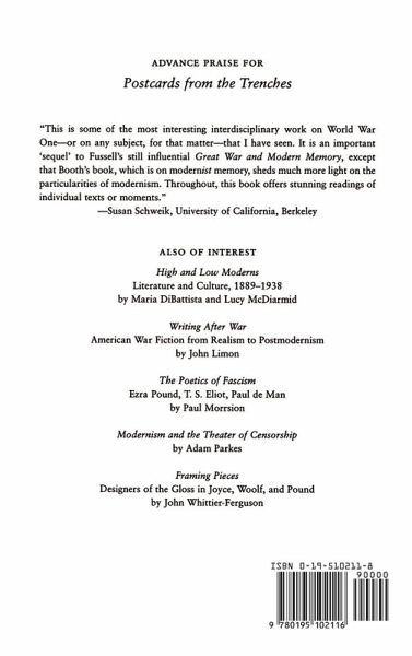 In Postcards from the Trenches, Allyson Booth traces the complex relationship between British Great War culture and modernist literature and architecture. By drawing on a wide range of materials and attending to the places where they overlap, Booth uncovers ways in which modernism is deeply embedded in a broader Great War culture. She links, for example, the modernist representation of an unstable self to soldiers' familiarity with corpses, the modernist mistrust for fact to the competing nationalist discourses of August 1914, and the modernist description of buildings as having shaken off the past to a desire to forget the war. Booth argues that the dislocations of war often figure centrally in modernist forms even when the war itself seems peripheral to modernist content. Thus she suggests that soldiers experienced the Great War as strangely modernist and that modernism itself is strangely haunted by the Great War.