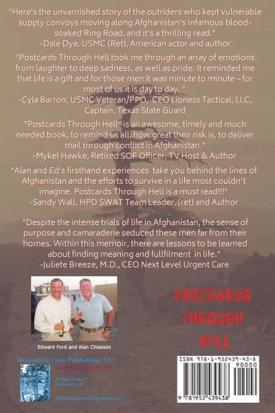POSTCARDS THROUGH HELL IS A TRUE TALE OF HEROISM AND SACRIFICE THAT TAKES READERS ONTO THE DEADLY ROADS OF AFGHANISTAN AS BRAVE SECURITY CONTRACTORS RISK THEIR LIVES TO DELIVER THE US MAIL TO OUR MILITARY WARRIORS ENGAGED IN A BLOODY WAR. "...rings with an authenticity that only comes from personal experience. Contracting is a different" world from the military, one that has little recognition yet was no less dangerous. In fact, it was even more dangerous, as these men did not have air or fire support. Only the bravest and most dedicated men would embark upon such missions. It stands to reason that they are part of the newest "greatest generation."-Colin D. Heaton, Author and Historian "Postcards Through Hell is a riveting journey through war-torn Afghanistan that shares the brave and daring ride of private military contractors as they fight their way through unforgiving territory day in and day out to deliver the US mail".-Scott Huesing, USMC (ret) Bestselling Author, Echo in RamadiTheir story is the incredible account of courage, heroism, and brotherhood overcoming fears that everyone experiences. These are the unsung heroes of America's longest war in the Middle East. This is a must-read non-fiction account for all those seeking to go beyond their perceived limitations.-Fred Galvin, USMC (ret) Bestselling Author, A Few Bad Men "This firsthand account takes you on an amazing journey to deliver the US mail and other critical supplies to our deployed troops in some of the most remote and dangerous outposts along the infamous Ring Road in Afghanistan. Risking everything to fulfill their mission, Alan and Ed share their incredible story of sacrifice and survival in Postcards Through Hell."-Amy Forsythe, USN/USMC PAO Bestselling Author, Heroes Live Here "In Postcards Through Hell, the men of the Pony Express are true patriots who risked life and limb to provide our military their only real connection to home, the US Mail. They are all heroes in my eyes, and I truly thank them for a job well done".-Patrick R. Donahoe, Former Postmaster General US Postal Service "As a former Green Beret, ... I never gave much thought to the modern-day warriors who resupplied Green Berets and other Special Operators in Afghanistan...until now. This book is a legacy story to the men who did the heavy lifting behind the scenes, to keep us all in the fight. We owe them a debt of gratitude. De Oppresso Libe"r.--Scott Mann, NYT Best-Selling Author of Operation Pineapple Express and Creator of "Last Out - Elegy of a Green Beret"