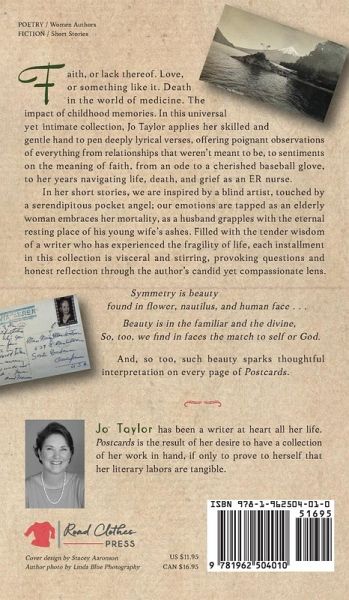Faith, or lack thereof. Love, or something like it. Death in the world of medicine. The impact of childhood memories. In this universal yet intimate collection, Jo Taylor applies her skilled and gentle hand to pen deeply lyrical verses, offering poignant observations of everything from relationships that weren't meant to be, to sentiments on the meaning of faith, from an ode to a cherished baseball glove, to her years navigating life, death, and grief as an ER nurse. In her short stories, we are inspired by a blind artist, touched by a serendipitous pocket angel; our emotions are tapped as an elderly woman embraces her mortality, as a husband grapples with the eternal resting place of his young wife's ashes. Filled with the tender wisdom of a writer who has experienced the fragility of life, each installment in this collection is visceral and stirring, provoking questions and honest reflection through the author's candid yet compassionate lens. Symmetry is beauty found in flower, nautilus, and human face . . . Beauty is in the familiar and the divine, So, too, we find in faces the match to self or God. And, so too, such beauty sparks thoughtful interpretation on every page of Postcards.