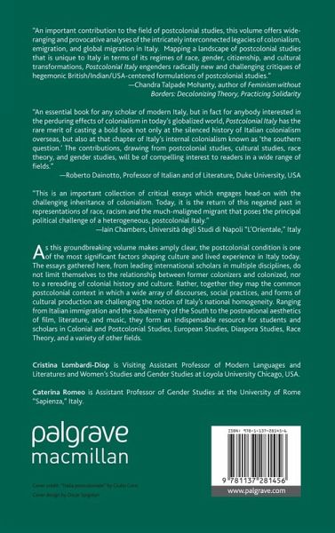 "An important contribution to the field of postcolonial studies, this volume offers wide-ranging and provocative analyses of the intricately interconnected legacies of colonialism, emigration, and global migration in Italy. Mapping a landscape of postcolonial studies that is unique to Italy in terms of its regimes of race, gender, citizenship and cultural transformations, Postcolonial Italy engenders radically new and challenging critiques of hegemonic British/Indian/USA centered formulations of postcolonial studies." - Chandra Talpade Mohanty, author of Feminism Without Borders, Decolonizing Theory, Practicing Solidarity (2003)