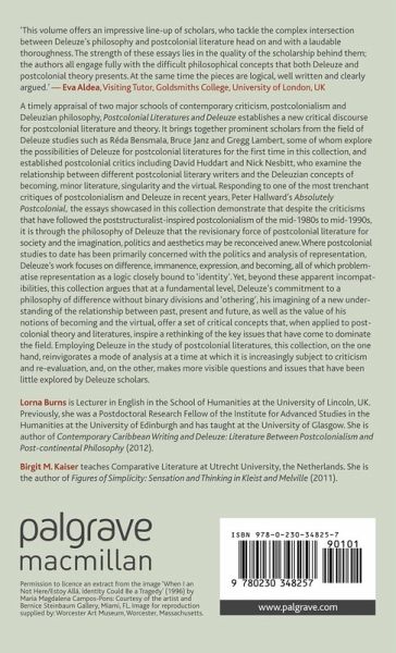 'This volume offers an impressive line-up of scholars, who tackle the complex intersection between Deleuze's philosophy and postcolonial literature head on and with a laudable thoroughness. The strength of these essays lies in the quality of the scholarship behind them; the authors all engage fully with the difficult philosophical concepts that both Deleuze and postcolonial theory presents. At the same time the pieces are logical, well written and clearly argued.' - Eva Aldea, Visiting Tutor, Goldsmiths College, University of London, UK