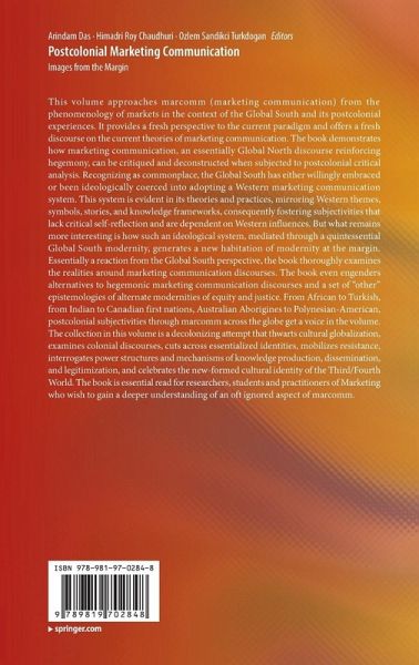 This volume approaches marcomm (marketing communication) from the phenomenology of markets in the context of the Global South and its postcolonial experiences. It provides a fresh perspective to the current paradigm and offers a fresh discourse on the current theories of marketing communication. The book demonstrates how marketing communication, an essentially Global North discourse reinforcing hegemony, can be critiqued and deconstructed when subjected to postcolonial critical analysis. Recognizing as commonplace, the Global South has either willingly embraced or been ideologically coerced into adopting a Western marketing communication system. This system is evident in its theories and practices, mirroring Western themes, symbols, stories, and knowledge frameworks, consequently fostering subjectivities that lack critical self-reflection and are dependent on Western influences. But what remains more interesting is how such an ideological system, mediated through a quintessential Global South modernity, generates a new habitation of modernity at the margin. Essentially a reaction from the Global South perspective, the book thoroughly examines the realities around marketing communication discourses. The book even engenders alternatives to hegemonic marketing communication discourses and a set of "other" epistemologies of alternate modernities of equity and justice. From African to Turkish, from Indian to Canadian first nations, Australian Aborigines to Polynesian-American, postcolonial subjectivities through marcomm across the globe get a voice in the volume. The collection in this volume is a decolonizing attempt that thwarts cultural globalization, examines colonial discourses, cuts across essentialized identities, mobilizes resistance, interrogates power structures and mechanisms of knowledge production, dissemination, and legitimization, and celebrates the new-formed cultural identity of the Third/Fourth World. The book is essential read for researchers, students and practitioners of Marketing who wish to gain a deeper understanding of an oft ignored aspect of marcomm.