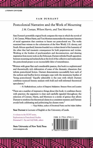 Sam Durrant's powerfully original book compares the ways in which the novels of J. M. Coetzee, Wilson Harris, and ToniMorrison memorialize the traumatic histories of racial oppression that continue to haunt our postcolonial era. The works examined bear witness to the colonization of the NewWorld, U.S. slavery, and South African apartheid, histories founded on a violent denial of the humanity of the other that had traumatic consequences for both perpetrators and victims. Working at the borders of psychoanalysis and deconstruction, and drawing inspiration from recent work on the Holocaust, Durrant rethinks Freud's opposition between mourning and melancholia at the level of the collective and rearticulates the postcolonial project as an inconsolable labor of remembrance.