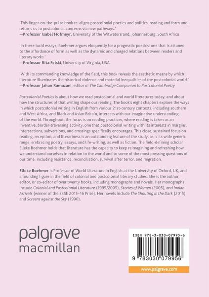 Postcolonial Poetics is about how we read postcolonial and world literatures today, and about how the structures of that writing shape our reading. The book's eight chapters explore the ways in which postcolonial writing in English from various 21st-century contexts, including southern and West Africa, and Black and Asian Britain, interacts with our imaginative understanding of the world. Throughout, the focus is on reading practices, where reading is taken as an inventive, border-traversing activity, one that postcolonial writing with its interests in margins, intersections, subversions, and crossings specifically encourages. This close, sustained focus on reading, reception, and literariness is an outstanding feature of the study, as is its wide generic range, embracing poetry, essays, and life-writing, as well as fiction. The field-defining scholar Elleke Boehmer holds that literature has the capacity to keep reimagining and refreshing how we understand ourselves inrelation tothe world and to some of the most pressing questions of our time, including resistance, reconciliation, survival after terror, and migration.