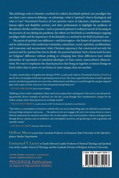 This anthology seeks to theorize a method of a radical, decolonial spiritual-care paradigm that can chart a new course in defining--or reframing--what is "spiritual," what is theological, and what is "care." Postcolonial Practices of Care presents voices of educators, chaplains, students, human-rights and disability activists, and other professionals to highlight the problems of disciplinary divides and binaries--such as pastoral/spiritual or ordinary/sacred. In focusing on the practices of care during the pandemic, the editors see their book as contributing to ongoing paradigm shifts and the importance of decoloniality as a method in the field of pastoral care. The praxis of spiritual care addresses--and interrogates--the history of spiritual violence and its imbrication with modernity/coloniality, colonialism, racial capitalism, neoliberalism, and (conscious and unconscious) white Christian supremacy that constructed not only the pastoral and the spiritual but also its divide: the pastoral/spiritual. Such a framework focuses on "religious" difference without probing or critiquing how those differences have reified hierarchies of superiority or sustained ideologies of Euro-centric monocultural ethnocentrism. We want to emphasize the shared practices that bring us together as human beings on Earth rather than to prove we are better, or more unique, than one another.