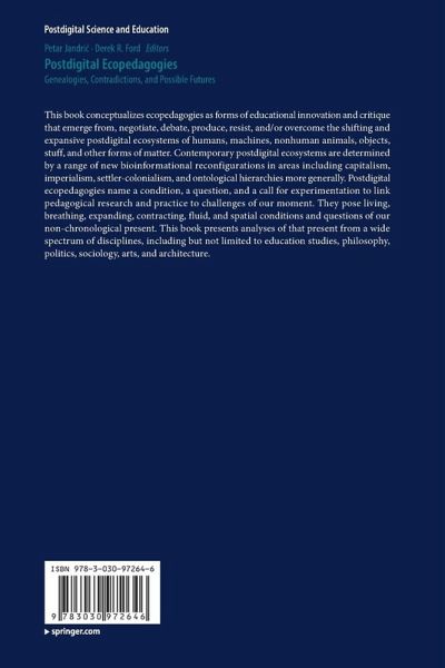 This book conceptualizes ecopedagogies as forms of educational innovation and critique that emerge from, negotiate, debate, produce, resist, and/or overcome the shifting and expansive postdigital ecosystems of humans, machines, nonhuman animals, objects, stuff, and other forms of matter. Contemporary postdigital ecosystems are determined by a range of new bioinformational reconfigurations in areas including capitalism, imperialism, settler-colonialism, and ontological hierarchies more generally. Postdigital ecopedagogies name a condition, a question, and a call for experimentation to link pedagogical research and practice to challenges of our moment. They pose living, breathing, expanding, contracting, fluid, and spatial conditions and questions of our non-chronological present. This book presents analyses of that present from a wide spectrum of disciplines, including but not limited to education studies, philosophy, politics, sociology, arts, and architecture.