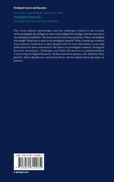 This book explores genealogies and the challenges related to the concept of the postdigital, the ambiguous nature of postdigital knowledges, and the many faces of postdigital sensibilities. The book answers three key questions: What is postdigital knowledge? What does it mean to do postdigital research? What, if anything, is distinct from research conducted in other perspectives? As such, this book is a one-stop publication for those interested in the theory of postdigital research. Postdigital Research: Genealogies, Challenges, and Future Perspectives is complemented by Constructing Postdigital Research: Method and Emancipation, also edited by Petar Jandric, Alison MacKenzie, and Jeremy Knox, which explores these questions in practice.