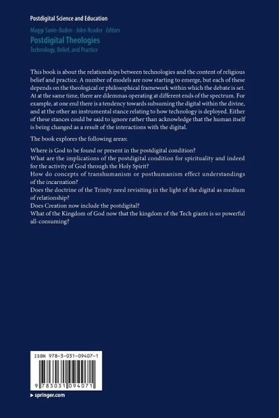 Part 1 Postdigital theologies.- Chapter 1 Introduction - Maggi Savin-Baden and John Reader.- Chapter 2 Landscapes of Postdigital Theologies.- Chapter 3 Interview with Catherine Keller - Petar Jandric.- Chapter 4 Community and communion in a postdigital world - Andrew Braddock.- Chapter 5 The Generative and Explanatory Potential of the Bible within Postdigital Discourse - Rebecca Dean.- Part 2 Postdigital conundrums.- Chapter 6 Divine Becoming in the Postdigital - John Reader.- Chapter 7 Unlikely Allies? Transhuman Dignity and Catholic Theology on Flourishing.- Alcibiades.- Chapter 8 Provoked by the Divine: The Event of the Postdigital Sublime - Eric Trozzo.- Chapter 9 Queering Postdigital Presence: Digital Afterlife as a Technology of Queer Continuity and Transformation - Jack Slater.- Chapter 10 Untitled Steve Fuller .- Part 3 Language, machines and theologies.- Chapter 11 Postdigital Humans: Technology and Divine Design - Douglas Estes.- Chapter 12 Machine Learning and Spiritual Wisdom for Contemporary Urban Environments.- - Paul Woods.- Chapter 13 Postdigital Theologies: A closer inspection of the way language is employed in digital discourses. - Simon Cross.- Chapter 14 Sacramental Engines: Charles Babbage and the Elements of Postdigital Theology- Ryan Haecker .- Part 4 The impact of the digital.- Chapter 15 When the Church Embraced a Posthuman Future: How Pastoral Negotiations with Technology During the Covid-19 Pandemic Resulted in an Implicit Acceptance of Posthumanism - Heidi Campbell.- Chapter 16 God Made Better: How the Quest for Human-Level AI Reshapes Postdigital Divinity - Agana-Nsiire Agana.- Chapter 17- Curiosity as a spirit of religious transcendence in the postdigital and post-trans-humanism era - Paulo Quadros.
