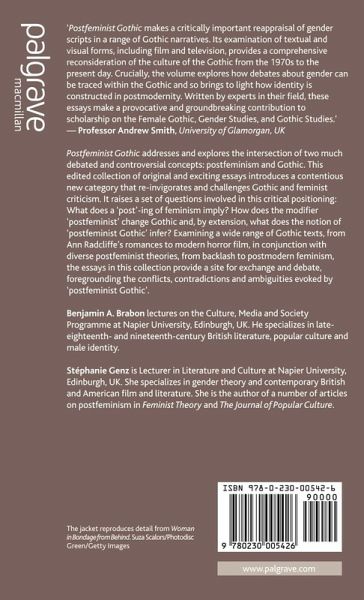 ' Postfeminist Gothic makes a critically important reappraisal of gender scripts in a range of Gothic narratives. Its examination of textual and visual forms, including film and television, provides a comprehensive reconsideration of the culture of the Gothic from the 1970s to the present day. Crucially, the volume explores how debates about gender can be traced within the Gothic and so brings to light how identity is constructed in postmodernity. Written by experts in their field, these essays make a provocative and groundbreaking contribution to scholarship on the Female Gothic, Gender Studies, and Gothic Studies.' - Professor Andrew Smith, University of Glamorgan, UK
