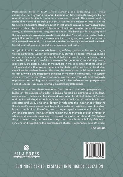 Postgraduate Study in South Africa: Surviving and Succeeding is a timely contribution to a growing national discourse on how students navigate higher education complexities in order to survive and succeed. The current evolving national narrative of emerging student voices that are making themselves heard from within the realms of higher education institutions across South Africa highlights concerns about the lack of higher education transformation around issues of equity, curriculum reform, language and race. This book provides a glimpse of the postgraduate experience amidst these debates. A variety of contextual factors may influence the initiation, development and progress, and eventual outcome of a postgraduate study - whether the student ultimately survives and succeeds. Institutional policies and regulations provide some direction. A myriad of published research literature, self-help guides, online resources, as well as institutional support programmes may provide guidance, while supervisors may provide mentoring and subject-related expertise. Family and friends may share the initial euphoria of the (sometimes first generation) candidate pursuing a postgraduate degree. Many of the authors in the book attest that the value of such contextual influences in supporting the study and, in particular, the student should not be underestimated. However, the contributors to this book also show us that surviving and succeeding demands more than a contextually rich support system. In fact, students' own self-reflective abilities, creativity and pragmatic approaches to surviving and succeeding are further indicators that postgraduate student success is as much internally as externally determined. The book explores these elements from various thematic perspectives. It builds on the success of similar initiatives focused on postgraduate students' experiences in Aotearoa New Zealand, Australia, the United States of America and the United Kingdom. Although each of the books in this series has its own character and unique national flavour, it highlights the importance of hearing the student's voice above and beyond its potential epistemic and discipline-based contribution. Therefore, each chapter speaks from a uniquely South African perspective. We have tried to remain true to the voice of each contributor, while simultaneously providing a coherent body of scholarly work. We believe this publication may become the catalyst for a continued scholarly debate on surviving and succeeding the postgraduate student's experience in South Africa. The Editors