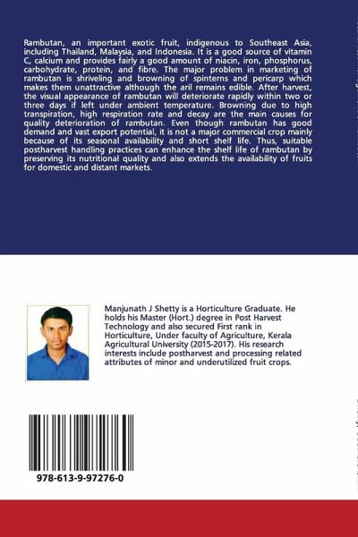 Rambutan, an important exotic fruit, indigenous to Southeast Asia, including Thailand, Malaysia, and Indonesia. It is a good source of vitamin C, calcium and provides fairly a good amount of niacin, iron, phosphorus, carbohydrate, protein, and fibre. The major problem in marketing of rambutan is shriveling and browning of spinterns and pericarp which makes them unattractive although the aril remains edible. After harvest, the visual appearance of rambutan will deteriorate rapidly within two or three days if left under ambient temperature. Browning due to high transpiration, high respiration rate and decay are the main causes for quality deterioration of rambutan. Even though rambutan has good demand and vast export potential, it is not a major commercial crop mainly because of its seasonal availability and short shelf life. Thus, suitable postharvest handling practices can enhance the shelf life of rambutan by preserving its nutritional quality and also extends the availability of fruits for domestic and distant markets.