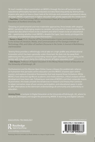 Posthumanism and the Massive Open Online Course critiques the problematic reliance on humanism that pervades online education and the MOOC, and explores theoretical frameworks that look beyond these limitations. While MOOCs (massive open online courses) have attracted significant academic and media attention, critical analyses of their development have been rare. Following an overview of MOOCs and their corporate means of promotion, this book unravels the tendencies in research and theory that continue to adopt normative views of user access, participation, and educational space in order to offer alternatives to the dominant understandings of community and authenticity in education.