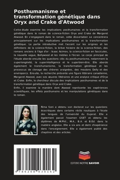 Cette étude examine les implications posthumaines et la transformation génétique dans le roman de science-fiction Oryx and Crake de Margaret Atwood. En s'engageant dans le roman, cette dissertation se concentrera principalement sur les implications posthumaines et la transformation génétique. La partie introductive met l'accent sur les origines et les définitions de la science-fiction, la brève histoire de la science-fiction, des romans anciens à l'âge d'or : Isaac Asimov, la science-fiction en fascicules, la nouvelle vague, Bollywood et les médias à l'écran. Le corps principal de l'étude aborde ensuite les questions clés du posthumanisme, notamment la superlongévité, la superintelligence et le superbien-être. Elle aborde également le transhumanisme, la transformation génétique et les processus de clonage des chèvres araignées, des moutons Dolly et des enviroporcs. Ensuite, la recherche présente une figure littéraire canadienne, Margaret Atwood, avec ses oeuvres littéraires et une analyse critique d'Oryx et Crake. Enfin, le chercheur discute des implications posthumaines et de la transformation génétique dans Oryx and Crake.Enfin, il examine la manière dont Atwood représente les expériences scientifiques, les effets posthumains et les manipulations génétiques dans le roman.