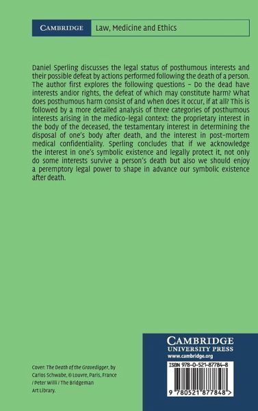 Daniel Sperling discusses the legal status of posthumous interests and their possible defeat by actions performed following the death of a person. The author first explores the following questions: Do the dead have interests and/or rights, the defeat of which may constitute harm? What does posthumous harm consist of and when does it occur, if at all? This is followed by a more detailed analysis of three categories of posthumous interests arising in the medico-legal context: the proprietary interest in the body of the deceased, the testamentary interest in determining the disposal of one's body after death and the interest in post-mortem medical confidentiality. Sperling concludes that if we acknowledge the interest in one's symbolic existence and legally protect it, not only do some interests survive a person's death but we should also enjoy a peremptory legal power to shape in advance our symbolic existence after death.