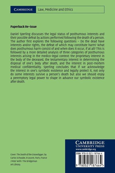 Daniel Sperling discusses the legal status of posthumous interests and their possible defeat by actions performed following the death of a person. The author first explores the following questions: Do the dead have interests and/or rights, the defeat of which may constitute harm? What does posthumous harm consist of and when does it occur, if at all? This is followed by a more detailed analysis of three categories of posthumous interests arising in the medico-legal context: the proprietary interest in the body of the deceased, the testamentary interest in determining the disposal of one's body after death and the interest in post-mortem medical confidentiality. Sperling concludes that if we acknowledge the interest in one's symbolic existence and legally protect it, not only do some interests survive a person's death but we should also enjoy a peremptory legal power to shape in advance our symbolic existence after death.