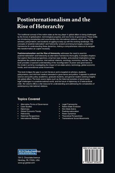The traditional concept of the nation-state as the key player in global affairs is being challenged by the forces of globalization, technological progress, and new forms of governance. These shifts are introducing complexities and uncertainties into international relations, which are leaving scholars, policymakers, and students struggling to keep up with the evolving landscape. The concepts of 'postinternationalism' and 'heterarchy' present promising but largely unexplored frameworks for understanding these dynamics, making a comprehensive resource to navigate this transformation an urgent necessity. Postinternationalism and the Rise of Heterarchy addresses the need to examine postinternationalism and heterarchy as alternative frameworks thoroughly. It compiles chapters that explore theoretical perspectives, empirical case studies, and practical implications across disciplines like political science, international relations, sociology, economics, and law. The book provides a nuanced understanding of the reconfiguration of power and governance in the modern world by investigating the impact of non-state actors, technology, global economic trends, and transnational social movements.