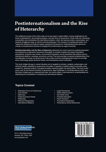The traditional concept of the nation-state as the key player in global affairs is being challenged by the forces of globalization, technological progress, and new forms of governance. These shifts are introducing complexities and uncertainties into international relations, which are leaving scholars, policymakers, and students struggling to keep up with the evolving landscape. The concepts of 'postinternationalism' and 'heterarchy' present promising but largely unexplored frameworks for understanding these dynamics, making a comprehensive resource to navigate this transformation an urgent necessity. Postinternationalism and the Rise of Heterarchy addresses the need to examine postinternationalism and heterarchy as alternative frameworks thoroughly. It compiles chapters that explore theoretical perspectives, empirical case studies, and practical implications across disciplines like political science, international relations, sociology, economics, and law. The book provides a nuanced understanding of the reconfiguration of power and governance in the modern world by investigating the impact of non-state actors, technology, global economic trends, and transnational social movements.
