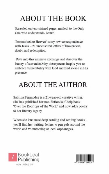 ""Scrawled on tear-stained pages, mailed to the Only One who understands- Jesus! 'Postmarked to Heaven' is my raw correspondence with Jesus - 21 uncensored letters of brokenness, doubt, and redemption. Dive into this intimate exchange and discover the beauty of surrender.May these poems inspire you to embrace vulnerability with God and find solace in His presence.""