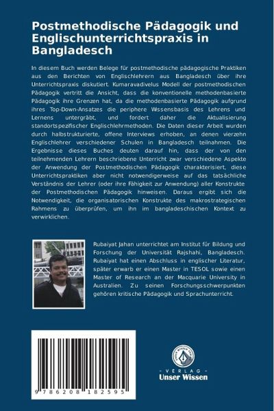In diesem Buch werden Belege für postmethodische pädagogische Praktiken aus den Berichten von Englischlehrern aus Bangladesch über ihre Unterrichtspraxis diskutiert. Kumaravadivelus Modell der postmethodischen Pädagogik vertritt die Ansicht, dass die konventionelle methodenbasierte Pädagogik ihre Grenzen hat, da die methodenbasierte Pädagogik aufgrund ihres Top-Down-Ansatzes die periphere Wissensbasis des Lehrens und Lernens untergräbt, und fordert daher die Aktualisierung standortspezifischer Englischlehrmethoden. Die Daten dieser Arbeit wurden durch halbstrukturierte, offene Interviews erhoben, an denen vierzehn Englischlehrer verschiedener Schulen in Bangladesch teilnahmen. Die Ergebnisse dieses Buches deuten darauf hin, dass der von den teilnehmenden Lehrern beschriebene Unterricht zwar verschiedene Aspekte der Anwendung der Postmethodischen Pädagogik charakterisiert, diese Unterrichtspraktiken aber nicht notwendigerweise auf das tatsächliche Verständnis der Lehrer (oder ihreFähigkeit zur Anwendung) aller Konstrukte der Postmethodischen Pädagogik hinweisen. Daraus ergibt sich die Notwendigkeit, die organisatorischen Konstrukte des makrostrategischen Rahmens zu überprüfen, um ihn im bangladeschischen Kontext zu verwirklichen.