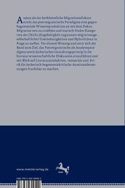 1. Literatur und Postmigration. Einleitung.- Teil I: Kritik der hegemonialen Wissensproduktion.- 2. Aleida Assmann: Erinnern in der Migrationsgesellschaft.- 3. Iulia-Karin Patrut: Macht und Wertung. Überlegungen zu einer Literaturtheorie der Postmigration.- Teil II: Grundlagen postmigrantischer Literatur und Kultur.- 4. Christine Meyer: "Writing back to Germany from the margins': Strategien der Kanon-Aneignung in der Minderheitenliteratur der Nachwendezeit.- 5. Jana-Katharina Mende: Mehrsprachigkeit, Übersetzung und Sprachreflexionen: Postmigrantische Spielformen von Mehrsprachigkeit in der Gegenwartsliteratur.- 6. Martina Kofer: Postmigrantische Identitätskonstruktionen.- 7. Michael Hofmann: Neue Perspektiven auf den literarischen Kanon aus postmigrantischer Perspektive.- 8. Ines Böker: Theatrale Bodenlosigkeit - Zum Zusammenhang von institutioneller, ästhetischer und wissenschaftlicher Widersetzlichkeit im postmigrantischen Theater.- 9. Isabelle Leitloff: Postmigrantische Gesellschaft im Film am Beispiel von Flávia Castros Deslembro und Florian Cossens Das Lied in mir.- 10. Nazli Hodaie: Postmigrantische Kinder- und Jugendliteratur.- Teil III: Exemplarische Analysen zu postmigrantischer Literatur und postmigrantischem Film.- 11. Michael Hofmann: Postmigrantische Gegenwartsliteratur. Profile, Genese und Texte.- 12. Magdalena Kißling/ Nadine Seidel: Vexierbilder als gegenhegemoniales Moment. Strategien postmigrantischen Erzählens bei Andrea Karimé.- 13. Hajnalka Nagy: Identitätsverhandlungen in postmigrantischen Räumen. Vladimir Vertlibs "Lucia Binar und die russische Seele".- 14. Rita Morrien: "German Dream" - German Nightmare: Paradoxien der postmigrantischen Gesellschaft in Burhan Qurbanis Berlin Alexanderplatz.- Teil IV: Postmigrantische Positionen.- 15. Zafer Senocak: Kafka in München. Über meine ersten Schreibversuche.- 16. Nazli Hodaie/Michael Hofmann: "Identitäten sind notwendige Lügen": Mithu Sanyal im Gespräch.- 17. Nazli Hodaie/Michael Hofmann: "Die Kunst des Wegmachens": Tomer Gardi im Gespräch.