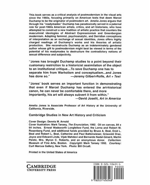 This book serves as a critical analysis of postmodernism in the visual arts since the 1960s, focusing primarily on American texts that deem Marcel Duchamp to be the originator of postmodern art. Amelia Jones argues that through his 'readymades' Duchamp has paradoxically served in a paternal role for post-1960s American artists, critics, and art historians, who have attempted to construct a new tradition of artistic practice that counters the masculinist ideologies of Abstract Expressionism and Greenbergian modernism.
