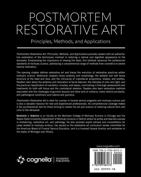 Postmortem Restorative Art: Principles, Methods, and Applications provides readers with an authoritative exploration of the techniques involved in restoring a natural and dignified appearance to the deceased. Emphasizing the importance of viewing the dead, this textbook advances the professional standards of mortuary science, addressing a comprehensive range of methods from cosmetics to severe trauma restoration. The opening chapter defines restorative art and traces the evolution of restorative practices within mortuary science. Additional chapters stress anatomy and morphology; the skeletal and soft tissue structure of the head and face; and the intricacies of craniofacial proportions, shapes, and profiles. Readers learn about the anatomy and restoration of facial features, the interplay of color and light, and the practical classification of cosmetics, brushes, and waxes, culminating in thorough assessments and treatments for both soft tissue and the craniofacial skeleton. Readers also learn restoration methods associated with the challenges of gunshot wounds and other acts of violence, motor vehicle accidents, and pathological conditions such edema and jaundice. Postmortem Restorative Art is ideal for courses in funeral service programs and mortuary science and is also a valuable resource for new and experienced professionals. Its comprehensive coverage makes it the quintessential text for those striving to master the art and science of restoring natural form and color to the deceased.