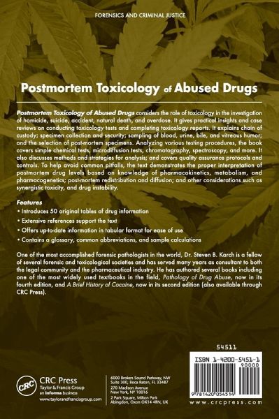 Postmortem Toxicology of Abused Drugs considers the role of toxicology in death investigation and gives practical insights on conducting toxicology tests and completing the toxicology report. It explains chain of custody; specimen collection and security; sampling of blood, urine, bile, and vitreous humor; and selection of post-mortem specimens. The book analyzes various testing procedures, discusses methods and strategies for analysis, covers quality assurance protocols and controls, and instructs in the proper interpretation of postmortem drug tests. Heavily referenced and containing several tables, figures, and useful appendices, this book is a handy reference for forensic scientists and medical examiners involved with death investigation.