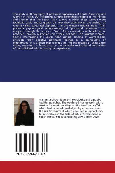 This study is ethnography of postnatal experiences of South Asian migrant women in Perth, WA examining cultural differences relating to mothering and arguing that the South Asian culture in which these women were socialized could impact greatly on how they experienced the feelings of what is called postnatal depression in the Western medical arena. Their postnatal psychological understandings of postnatal depression was analysed through the lenses of South Asian convention of female virtue practiced through restrictions on female behavior. The migrant women, having internalizing the South Asian cultural schema of womanhood, articulate their negative postnatal feelings as a prerequisite of motherhood. It is argued that feelings are not the totality of experience; rather, experience is formulated by the particular sociocultural perspective of the individual who is having the experience.