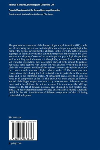 Ume Eder Bat (A beautiful child) (popular song from Basque folklore) The aim of this monograph is to introduce the postnatal development of morphological features that are relevant to readers interested in the neurobiology and pathology of the hippocampal formation in terms of the complex phenomena that underlie the progressive anatomical and functional maturation of this brain region. This review focuses on the morphological aspects, while more detailed basic phenomena associated with neuronal maturation-which are undoubtedly also of great interest-are only marginally referred to, although a selection of behavioral and clinical aspects will also be briefly addressed in an attempt to illustrate real situations in different clinical specialties. The creation of this monograph is justified by the increasing importance and growing awareness shown in recent years of neurodevelopmental disorders in children. This awareness is leading to increasing refinement in clinical exami- tions of patients that may suffer from different neurodevelopment-related diseases, such as autism, epilepsy, memory disorders, etc. To the best of our knowledge, this work is the first comprehensive description of the postnatal changes in the hip- campal formation in its different constituent fields. Given the growing sensitivity and accuracy of neuroradiological examinations, particularly MRI, we also sought to offer a glimpse at the MRI aspects related to the development of the hippocampal formation in the human infant.