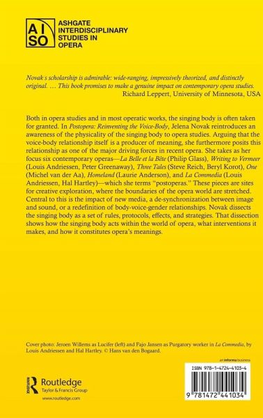 Both in opera studies and in most operatic works, the singing body is often taken for granted. In Postopera: Reinventing the Voice-Body, Jelena Novak reintroduces an awareness of the physicality of the singing body to opera studies. Arguing that the voice-body relationship itself is a producer of meaning, she furthermore posits this relationship as one of the major driving forces in recent opera. She takes as her focus six contemporary operas - La Belle et la Bête (Philip Glass), Writing to Vermeer (Louis Andriessen, Peter Greenaway), Three Tales (Steve Reich, Beryl Korot), One (Michel van der Aa), Homeland (Laurie Anderson), and La Commedia (Louis Andriessen, Hal Hartley) - which she terms 'postoperas'. These pieces are sites for creative exploration, where the boundaries of the opera world are stretched. Central to this is the impact of new media, a de-synchronization between image and sound, or a redefinition of body-voice-gender relationships. Novak dissects the singing body as a set of rules, protocols, effects, and strategies. That dissection shows how the singing body acts within the world of opera, what interventions it makes, and how it constitutes opera's meanings.