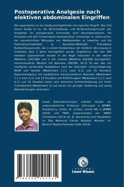 Die Laparotomie ist ein häufig durchgeführter chirurgischer Eingriff. Das Ziel dieser Studie ist es, die Verschreibungs- und Verabreichungsmuster von Analgetika für postoperative Schmerzen nach Bauchoperationen, die Prävalenz und den Schweregrad postoperativer Schmerzen zu untersuchen, die unerwünschten Wirkungen von Medikamenten zu bewerten und die Patientenzufriedenheit zu beurteilen.Methodik: Prospektive Beobachtungsstudie, die in einem Krankenhaus der tertiären Versorgung in Südindien über 2 Jahre durchgeführt wurde. Ergebnisse: Von den 289 elektiven Laparotomien wurden in der Regel Inzisionen in der oberen Mittellinie (191/289) und in der unteren Mittellinie (64/289) durchgeführt. Intramuskuläres Morphin mit Ketorolac (99/289; 34,25 %) war das am häufigsten verwendete Analgetikum nach der Operation. Schlussfolgerung: NSAR und Opioide (Medianwert 1,2,1 nach 6,12 und 24 Stunden), Epiduralanalgesie mit zusätzlichem intramuskulärem Ketorolac (Medianwert 1,2,2 nach 6,12 und 24 Stunden) und PCEA-Gruppen (Medianwert 2,2,1 nach 6,12 und 24 Stunden) boten eine wirksame Schmerzlinderung mit hoher Zufriedenheit (Medianwert 3) und waren mit geringer Sedierung und wenig Nebenwirkungen verbunden.