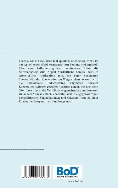 Ebenso wie ein "Sei doch mal spontan" eher selten wirkt, ist der Appell eines "Seid kooperativ" nur bedingt wirkungsvoll. Klar, eine Aufforderung kann motivieren. Allein die Notwendigkeit zum Appell verdeutlicht bereits, dass es offensichtlich Hindernisse gibt, die einer konstanten Spontanität oder Kooperation im Wege stehen. Warum wird die individuelle Entscheidung zugunsten sozialer Kooperation seltener getroffen? Warum ringen wir uns nicht öfter dazu durch, die Verhältnisse gemeinsam zum Besseren zu ändern? Dieses Buch charakterisiert die gegenwärtigen postpolitischen Konstellationen und skizziert Wege zu einer Konzeption kooperativer Handlungsmacht.