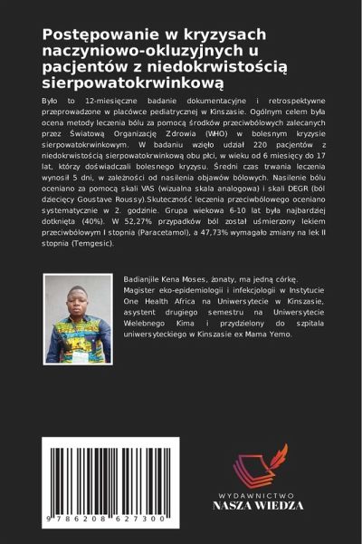 By¿o to 12-miesi¿czne badanie dokumentacyjne i retrospektywne przeprowadzone w placówce pediatrycznej w Kinszasie. Ogólnym celem by¿a ocena metody leczenia bólu za pomoc¿ ¿rodków przeciwbólowych zalecanych przez ¿wiatow¿ Organizacj¿ Zdrowia (WHO) w bolesnym kryzysie sierpowatokrwinkowym. W badaniu wzi¿¿o udziä 220 pacjentów z niedokrwisto¿ci¿ sierpowatokrwinkow¿ obu p¿ci, w wieku od 6 miesi¿cy do 17 lat, którzy do¿wiadczali bolesnego kryzysu. ¿redni czas trwania leczenia wynosi¿ 5 dni, w zale¿no¿ci od nasilenia objawów bólowych. Nasilenie bólu oceniano za pomoc¿ skali VAS (wizualna skala analogowa) i skali DEGR (ból dzieci¿cy Goustave Roussy).Skuteczno¿¿ leczenia przeciwbólowego oceniano systematycznie w 2. godzinie. Grupa wiekowa 6-10 lat by¿a najbardziej dotkni¿ta (40%). W 52,27% przypadków ból zostä u¿mierzony lekiem przeciwbólowym I stopnia (Paracetamol), a 47,73% wymagäo zmiany na lek II stopnia (Temgesic).