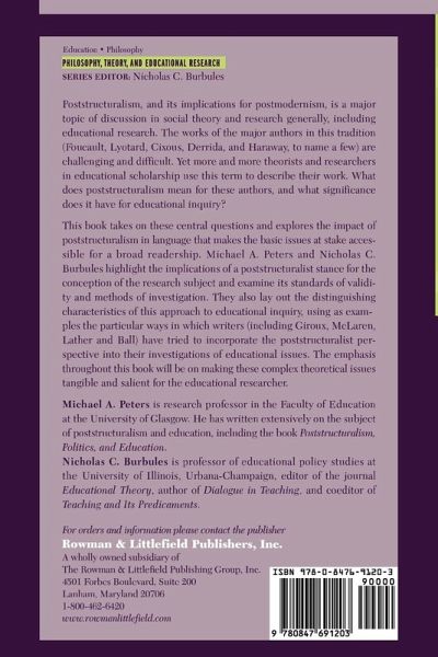 Poststructuralism, and its implications for something called 'postmodernism,' is a major topic of discussion in social theory and research generally, including educational research. The works of the major authors in this tradition (Foucault, Lyotard, Cixous, Derrida, Haraway, to name a few) are challenging and difficult. Yet more and more theorists and researchers in educational scholarship use this term to describe their work. What does poststructuralism mean for these authors, and what significance does it have for educational inquiry? This book takes on these central questions and explores the impact of poststructuralism in language that makes the basic issues at stake accessible for a broad readership. Michael Peters and Nicholas C. Burbules highlight the implications of a poststructuralist stance for the conception of the research subject and examine its standards of validity and methods of investigation. They also lay out the distinguishing characteristics of this approach to educational inquiry, using as examples the particular ways in which writers (including Giroux, McLaren, Lather, and Ball) have tried to incorporate the poststructuralist perspective into their investigations of educational issues. The emphasis throughout this book will be on making these complex theoretical issues tangible and salient for the educational researcher.