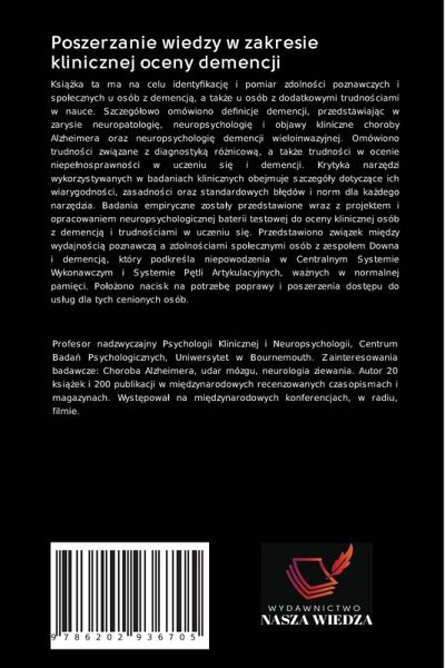 Ksi¿¿ka ta ma na celu identyfikacj¿ i pomiar zdolno¿ci poznawczych i spo¿ecznych u osób z demencj¿, a tak¿e u osób z dodatkowymi trudno¿ciami w nauce. Szczegó¿owo omówiono definicje demencji, przedstawiaj¿c w zarysie neuropatologi¿, neuropsychologi¿ i objawy kliniczne choroby Alzheimera oraz neuropsychologi¿ demencji wieloinwazyjnej. Omówiono trudno¿ci zwi¿zane z diagnostyk¿ ró¿nicow¿, a tak¿e trudno¿ci w ocenie niepe¿nosprawno¿ci w uczeniu si¿ i demencji. Krytyka narz¿dzi wykorzystywanych w badaniach klinicznych obejmuje szczegó¿y dotycz¿ce ich wiarygodno¿ci, zasadno¿ci oraz standardowych b¿¿dów i norm dla kädego narz¿dzia. Badania empiryczne zostäy przedstawione wraz z projektem i opracowaniem neuropsychologicznej baterii testowej do oceny klinicznej osób z demencj¿ i trudno¿ciami w uczeniu si¿. Przedstawiono zwi¿zek mi¿dzy wydajno¿ci¿ poznawcz¿ a zdolno¿ciami spo¿ecznymi osób z zespo¿em Downa i demencj¿, który podkre¿la niepowodzenia w Centralnym Systemie Wykonawczym i Systemie P¿tli Artykulacyjnych, wänych w normalnej pami¿ci. Po¿o¿ono nacisk na potrzeb¿ poprawy i poszerzenia dost¿pu do us¿ug dla tych cenionych osób.