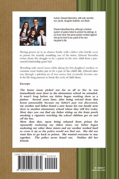 ALL AUTHOR PROFITS WILL BE DONATED TO HELP END CHILD ABUSE. Having grown up in an abusive family with a father who briefly went to prison for sexually assaulting one of his sisters, Edward Sternisha writes about the struggle to be a parent to his own child from a pre-marital relationship gone bad. Edward takes you through a spiraling set of two stories that eventually become one in his life-long journey to break the cycle of child abuse. This hard-to-believe True Story even includes a daring car chase involving a dangerous rapist while also telling the stories of an exhaustive cover-up of years of sexual and physical abuse. This winding story is told to bring a voice to the many victims, who even as adults, still bear many scars from childhood. This author will not take one penny from the sales of this book. All author profits will be donated to programs working to end child abuse. Please encourage others to support this cause by buying a book.