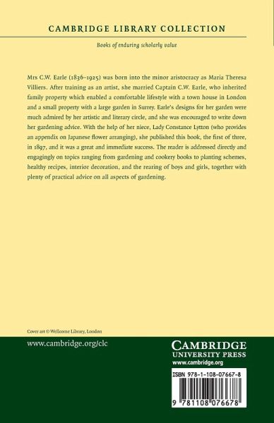 Mrs C. W. Earle (1836-1925) was born into the minor aristocracy as Maria Theresa Villiers. After training as an artist, she married Captain C. W. Earle, who inherited family property which enabled a comfortable lifestyle with a town house in London and a small property with a large garden in Surrey. Earle's designs for her garden were much admired by her artistic and literary circle, and she was encouraged to write down her gardening advice. With the help of her niece, Lady Constance Lytton (who provides an appendix on Japanese flower arranging), she published this book, the first of three, in 1897, and it was a great and immediate success. The reader is addressed directly and engagingly on topics ranging from gardening and cookery books to planting schemes, healthy recipes, interior decoration, and the rearing of boys and girls, together with plenty of practical advice on all aspects of gardening.