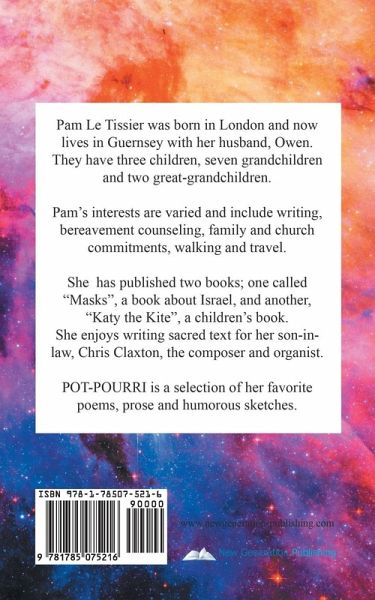 Pam Le Tissier was born in London and now lives in Guernsey with her husband, Owen. They have three children, seven grandchildren and two great-grandchildren. Pam's interests are varied and include writing, bereavement counseling, family and church commitments, walking and travel. She has published two books; one called "Masks", a book about Israel, and another, "Katy the Kite", a children's book. She enjoys writing sacred text for her son-in-law, Chris Claxton, the composer and organist. POT-POURRI is a selection of her favorite poems, prose and humorous sketches.