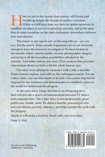 In 1848 Catherine was transported aboard the New Liverpoolto Australia where she went on to survive a harsh life in the Victorian goldfields, the loss of two husbands, and the loss of five of her thirteen children. She survived hunger, thirst, poverty, floods, bushfires, riots and family tragedy. Her resilience saw her live until l914. It is a story that takes us back seven generations Here we are today in the twenty-first century, still living and breathing despite the threats of nuclear extinction. While we still have time, we strive to define ourselves, to establish our place in an ever-expanding universe, and at the same time to place ourselves on the time continuum, somewhere between here and eternity. 'The future is not ours to see', as the song tells us - que sera sera. But the past is. It has already happened and we are fortunate enough to have the means to investigate it. We have historical documents, letters, diaries, public records, photographic imagery and to top it off the boundless possibilities afforded by the internet. And better still we now have DNA analysis that provides information about our links with the whole human race. This story is an attempt to reconnect with Cathy, the humble Potato Famine orphan, and with us, her subsequent family. For me, Cathy's story was one that needs to be told. One cannot help but be inspired by her resilience and determination to establish a place in the world for herself and her progeny. At the same time, I hope that this is an intriguing story that will provide a source of entertainment between TV shows and computer time. The Cathy story is not about royalty, great politicians, wealth, fame. It's about a humble, peasant-girl who survives famine, poverty, illiteracy, and helps people the earth with her progeny. Maybe it will strike a familiar chord with your own story.