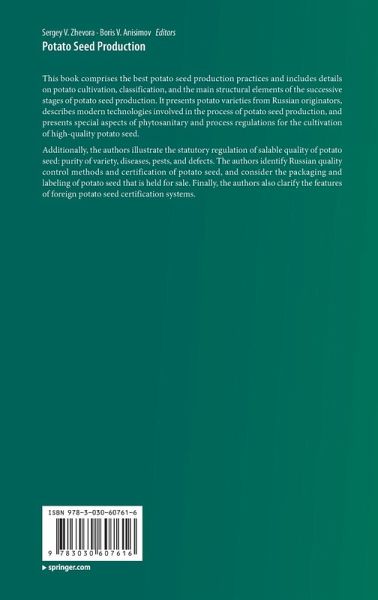 This book comprises the best potato seed production practices and includes details on potato cultivation, classification, and the main structural elements of the successive stages of potato seed production. It presents potato varieties from Russian originators, describes modern technologies involved in the process of potato seed production, and presents special aspects of phytosanitary and process regulations for the cultivation of high-quality potato seed.