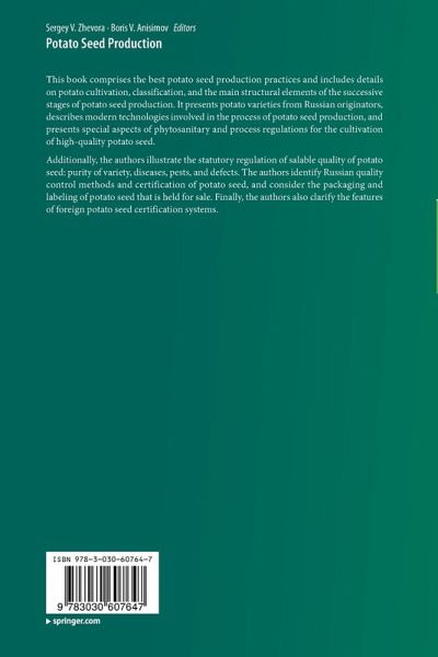 This book comprises the best potato seed production practices and includes details on potato cultivation, classification, and the main structural elements of the successive stages of potato seed production. It presents potato varieties from Russian originators, describes modern technologies involved in the process of potato seed production, and presents special aspects of phytosanitary and process regulations for the cultivation of high-quality potato seed.