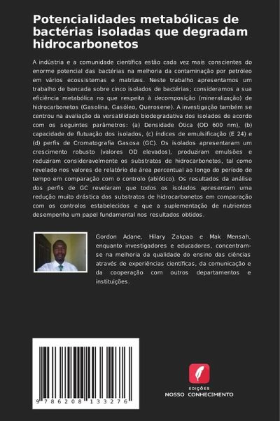 A indústria e a comunidade científica estão cada vez mais conscientes do enorme potencial das bactérias na melhoria da contaminação por petróleo em vários ecossistemas e matrizes. Neste trabalho apresentamos um trabalho de bancada sobre cinco isolados de bactérias; consideramos a sua eficiência metabólica no que respeita à decomposição (mineralização) de hidrocarbonetos (Gasolina, Gasóleo, Querosene). A investigação também se centrou na avaliação da versatilidade biodegradativa dos isolados de acordo com os seguintes parâmetros: (a) Densidade Ótica (OD 600 nm), (b) capacidade de flutuação dos isolados, (c) índices de emulsificação (E 24) e (d) perfis de Cromatografia Gasosa (GC). Os isolados apresentaram um crescimento robusto (valores OD elevados), produziram emulsões e reduziram consideravelmente os substratos de hidrocarbonetos, tal como revelado nos valores de relatório de área percentual ao longo do período de tempo em comparação com o controlo (abiótico). Os resultados da análise dos perfis de GC revelaram que todos os isolados apresentam uma redução muito drástica dos substratos de hidrocarbonetos em comparação com os controlos estabelecidos e que a suplementação de nutrientes desempenha um papel fundamental nos resultados obtidos.