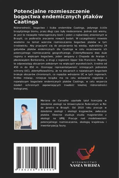 Ró¿norodno¿¿, bogactwo i liczba endemitów Caatinga, jedynego ¿ci¿le brazylijskiego biomu, przez d¿ugi czas by¿y niedoceniane. Jednak dzi¿ wiemy, ¿e jest to niezwykle heterogeniczny biom i jeden z najbardziej zmienionych w Brazylii, co podkre¿la znaczenie nowych badä. W szczególno¿ci niewiele wiadomo na temat wzorców rozmieszczenia bogactwa ptaków w tym ¿rodowisku. Aby przyczyni¿ si¿ do poszerzenia tej wiedzy, wybrali¿my 29 gatunków ptaków endemicznych dla Caatinga w celu oszacowania ich potencjalnego rozmieszczenia geograficznego. Zidentyfikowano dwa du¿e regiony o wi¿kszym bogactwie, jeden zwi¿zany z Chapada do Araripe i p¿askowy¿em Borborema, a drugi z regionem Upper São Francisco. Regiony te odpowiadaj¿ obszarom po¿o¿onym na wi¿kszych wysoko¿ciach, ¿rednio od 450 m do 850 m. Oceniaj¿c reprezentatywno¿¿ istniej¿cych jednostek ochrony (UC), zidentyfikowali¿my, ¿e na obszarach o najwi¿kszym bogactwie brakuje obszarów chronionych, co nap¿dza wdräanie UC w tych regionach. Krótko mówi¿c, niniejsza ksi¿¿ka ma na celu wskazanie regionów o najwi¿kszym bogactwie endemicznych ptaków Caatinga, w celu wsparcia dziää ochronnych zapewniaj¿cych trwäo¿¿ lokalnej ró¿norodno¿ci biologicznej.