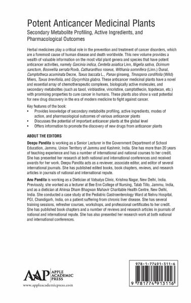 A wealth of valuable information on the most vital plant genera and species that have potent anticancer activities. It provides knowledge of secondary metabolite profiling, active ingredients, modes of action, and pharmacological outcomes and discusses their potential of important anticancer plants at the global level.