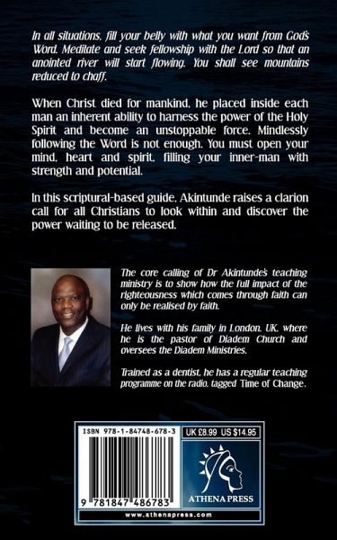 In all situations, fill your belly with what you want from God's Word. Meditate and seek fellowship with the Lord so that an anointed river will start flowing. You shall see mountains reduced to chaff. When Christ died for mankind, he placed inside each man an inherent ability to harness the power of the Holy Spirit and become an unstoppable force. Mindlessly following the Word is not enough. You must open your mind, heart and spirit, filling your inner-man with strength and potential. In this scriptural-based guide, Akintunde raises a clarion call for all Christians to look within and discover the power waiting to be released. The core calling of Dr Akintunde's teaching ministry is to show how the full impact of the righteousness which comes through faith can only be realised by faith. He lives with his family in London, UK, where he is the pastor of Diadem Church and oversees the Diadem Ministries. Trained as a dentist, he has a regular teaching programme on the radio, tagged Time of Change.