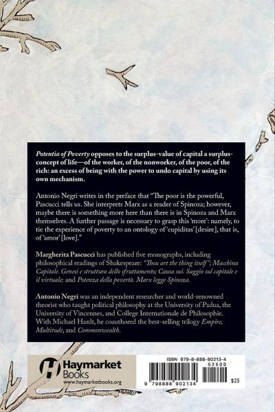 Potentia of Poverty opposes to the surplus-value of capital a surplus-concept of life-of the worker, of the non-worker, of the poor, of the rich: an excess of being with the power to undo capital by using its own mechanism. Antonio Negri writes in the preface that "The poor is the powerful, Pascucci tells us. She interprets Marx as a reader of Spinoza; however, maybe there is something more here than there is in Spinoza and Marx themselves. A further passage is necessary to grasp this "more": namely, to tie the experience of poverty to an ontology of "cupiditas" [desire], that is, of "amor" [love]".