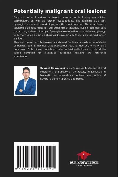 Diagnosis of oral lesions is based on an accurate history and clinical examination, as well as further investigations. The toluidine blue test, cytological examination and biopsy are the most common. The now obsolete toluidine blue test looks for the presence of atypical, nucleic acid-rich cells that strongly absorb the dye. Cytological examination, or exfoliative cytology, is performed on a sample obtained by scraping epithelial cells spread out on a slide. This easy-to-perform technique is indicated for lesions such as candidiasis or bullous lesions, but not for precancerous lesions, due to the many false negatives. Only biopsy, which provides a histopathological study of the tissue removed for diagnostic purposes, remains the reference examination.